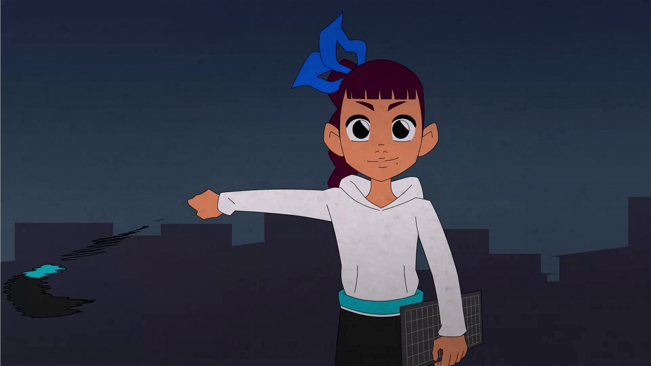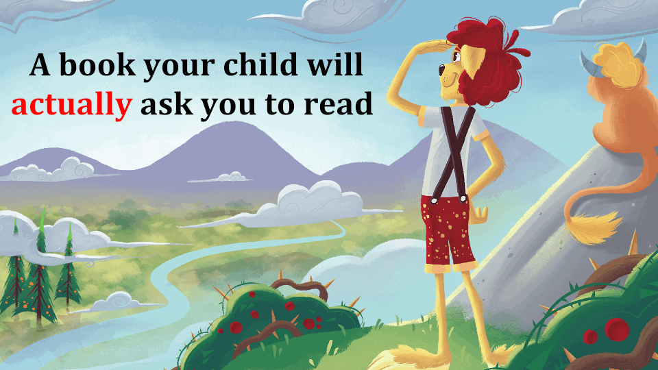 A girl with blonde hair in braids walking on a dirt path with a small mouse following her, in front of a large colorful treehouse with multiple levels, surrounded by trees, and a group of children walking with backpacks. View fullsize