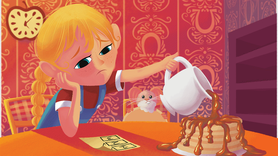 A young girl with blonde hair in a braid looks unhappy as she pours chocolate sauce onto a cake with a white teapot, with a tabby cat sitting beside her. The room has ornate red wallpaper, a clock showing 2:40, and a purple bookshelf in the backgroun View fullsize