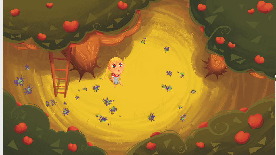A girl sitting on the ground in the middle of an apple orchard, surrounded by two trees with apples and a ladder leaning against one tree, with a yellowish glow in the background.