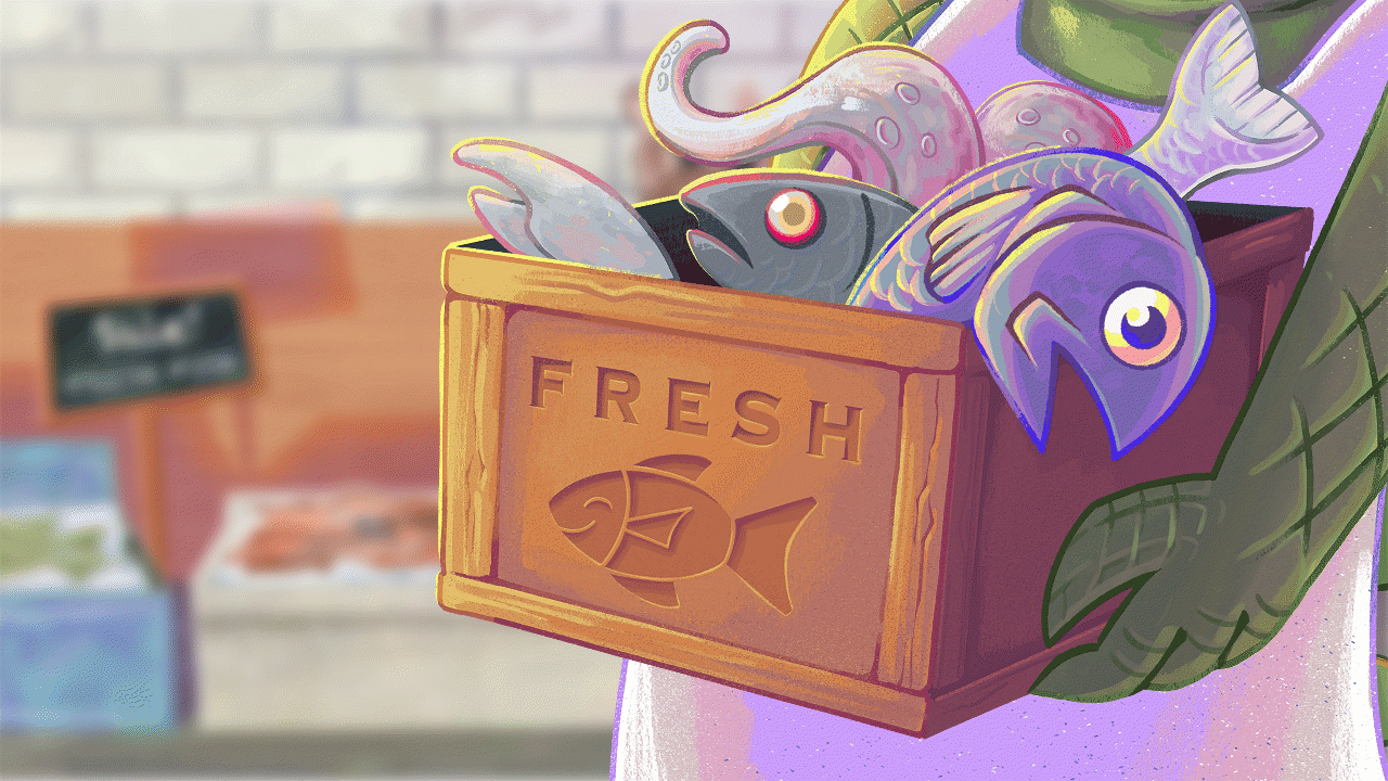 Illustration of a hand holding a wooden crate labeled 'FRESH' with a fish symbol, filled with various colorful fish and an octopus, against the background of a grocery store.