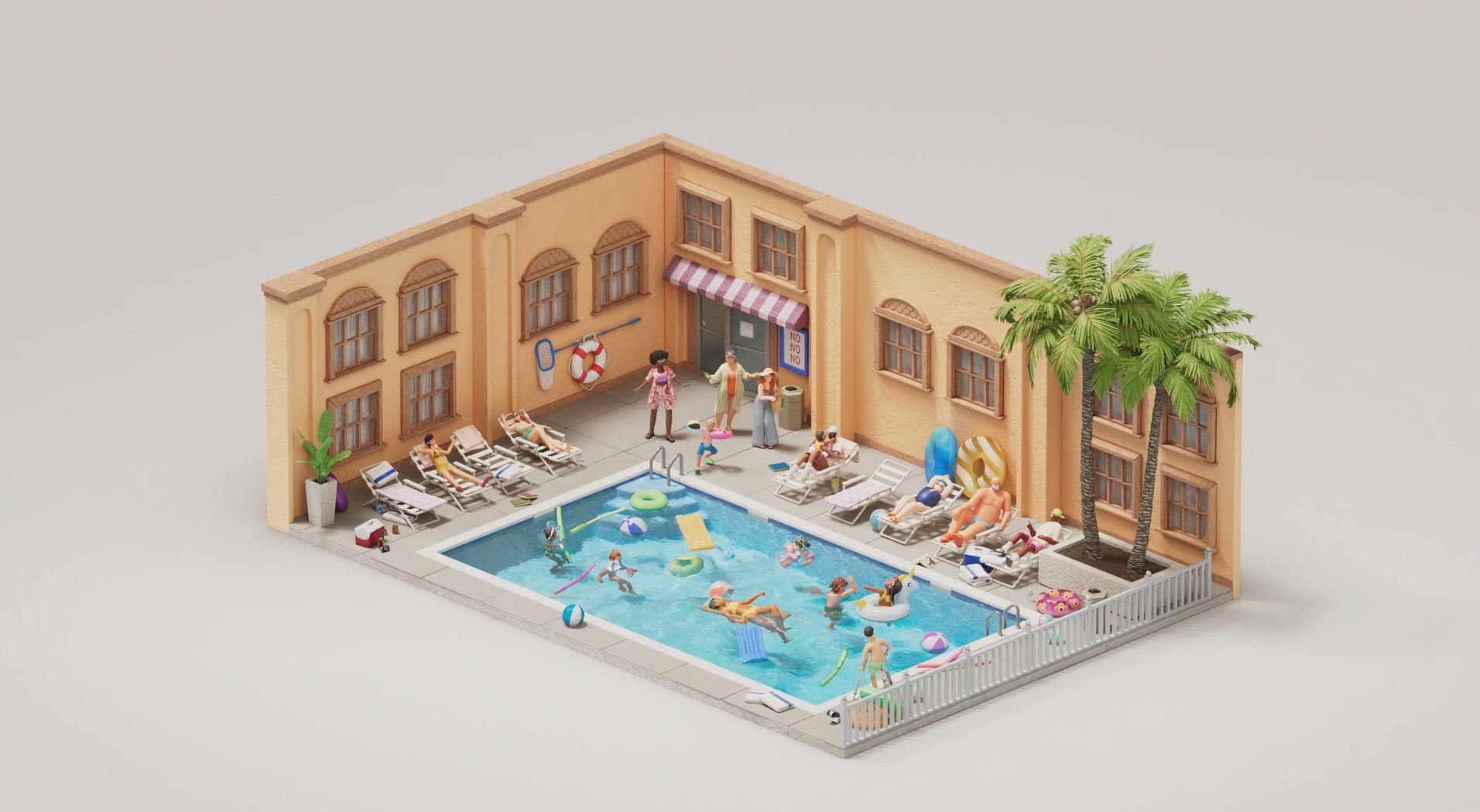 AIRBNB We were responsible for the shot of the characters in the pool and around the pool in the long shot. We animated many characters swimming, splashing around, and interacting with each other.